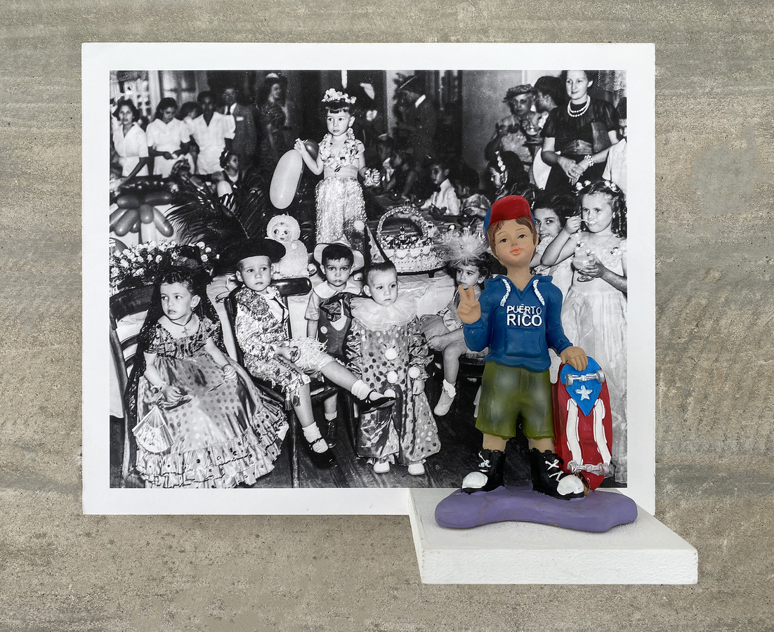 fotografía sobre panel y figura de poliresina.